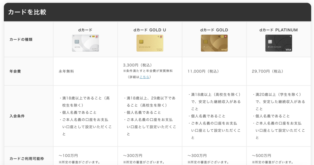 とはいえカードの利率はすべて1%(100円ごとに1ポイント)なので同じですが、d払いをした場合の特典などは変わってくるので、メインのカードはなるべく上位のものが良いです。